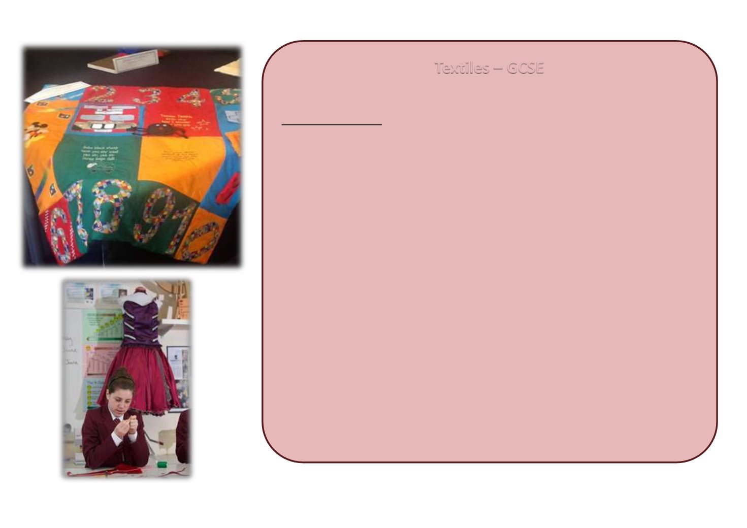 This makes up 60% of the course and is supported by textiles theory – 40%. Activities in Year 10 are a